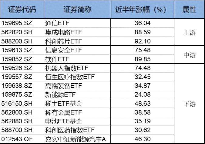 不止是单只产品的领先,嘉实基金在多个细分领域的产品簇也是颇为丰富。以今年大涨的科技赛道为例,从2023年初的ChatGPT引爆市场,后续各种突破性创新作为催化剂,AI产业链的各个细分领域均展现出你方唱罢我登场的热闹格局。下图为截至3月14日,近半年涨幅:
