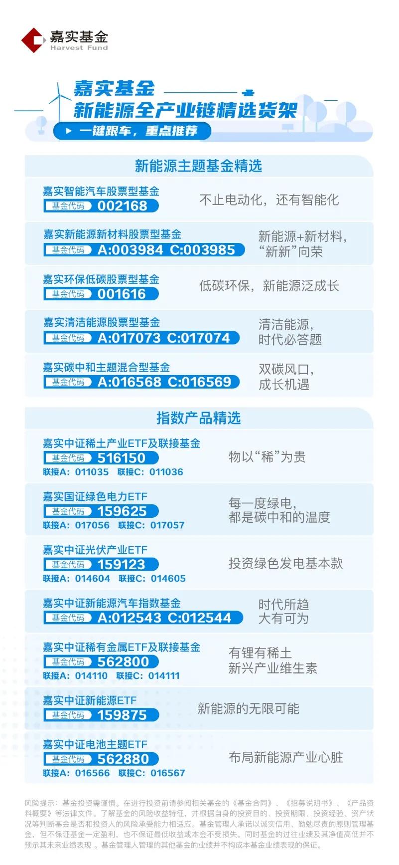 被动指数产品方面,在新能源新材料方向,嘉实基金体系化布局了包括上游材料端的稀土ETF嘉实(516150)及联接、稀有金属ETF(562800)及联接;发电端的光伏ETF嘉实(159123)及联接、绿色电力ETF(159625)及联接;储能及用电端的电池ETF嘉实(562880)及联接、嘉实中证新能源汽车指数(012543),以及跟踪新能源产业整体表现的新能源ETF(159875)等等,全面覆盖新能源行业的各领域。